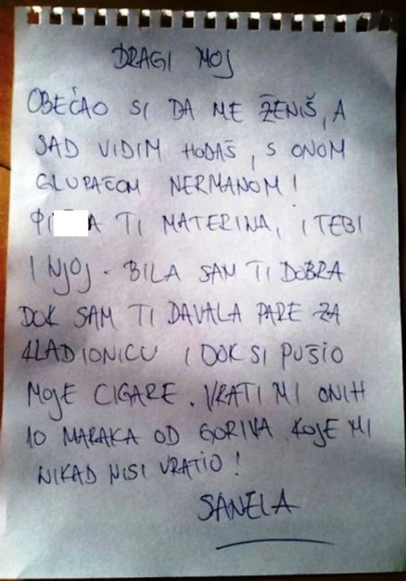 - Dragi moj, obećao si da me ženiš, a sada vidim hodaš s onom glupačom Nermanom. Pi**a ti materina, i tebi i njoj. Bila sam ti dobra dok sam ti davala pare za kladionicu i dok si pušio moje cigare. Vrati mi onih 10 maraka od goriva koje mi nikada nisi vrati – piše u poruci ispod koje se potpisala Sanela, a fotografija ove neobične poruke objavljena je na portalu Radiosarajevo.ba. Verujemo da su se korisnici društvenih mreža od srca nasmejali dok su čitali ovu poruku.