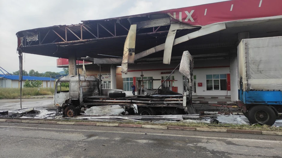 Da stvar bude gora, buknuo je požar u kome su potpuno izgoreli kamioni, a zahvatio je i deo benzinske pumpe.