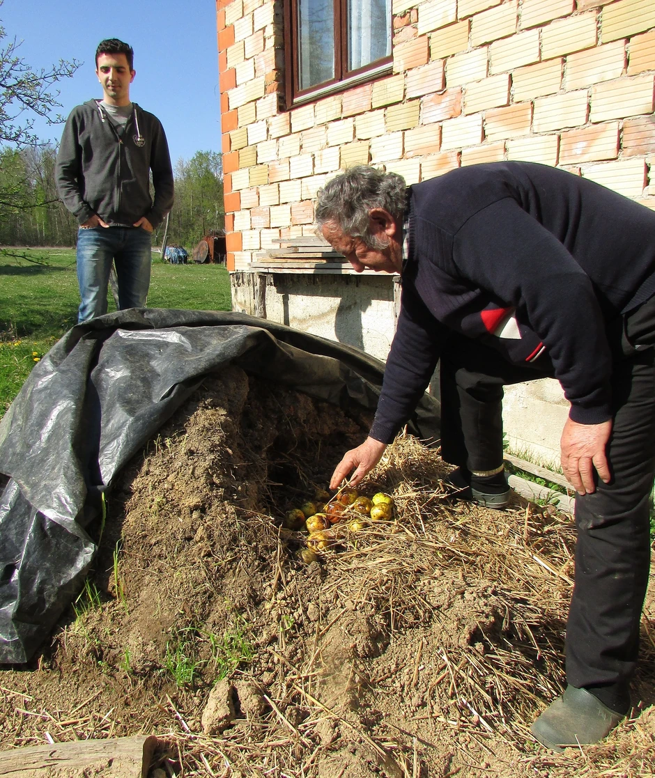 U trapu, pod zemljom i slamom uskladištio je prošle jeseni jabuke zelenike. Jesu, veli, malo prljave od kiše i vlage ali to nije umanjilo njihov okus i miris, samo što gotovo niko ne veruje u njegove tvrdnje.