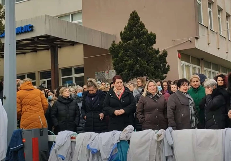 Dramatično je jutros u Konjicu ispred Opšte bolnice, jer su zdravstveni radnici kolektivno prestali s radom i skinuli bele mantile, navodeći kako su im porodice dovedeni na rub egzistencije jer od jula nisu primili plate zbog blokiranih računa.