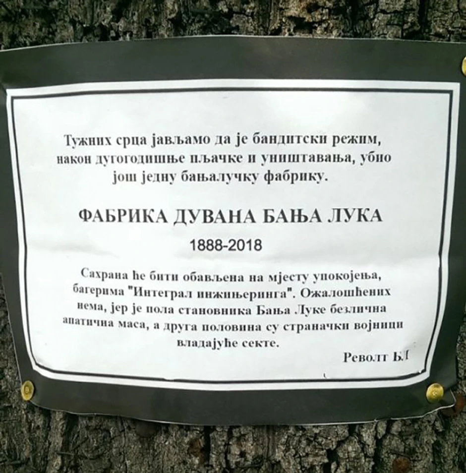 Jedina značajnija reakcija javnosti, nakon zatvaranja „duvanjare”, bile su smrtovnice za „pokojnu” fabriku, koji su po gradu polepili članovi tajne aktivističke grupe „Pravda BL”.