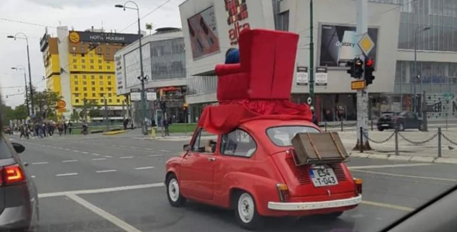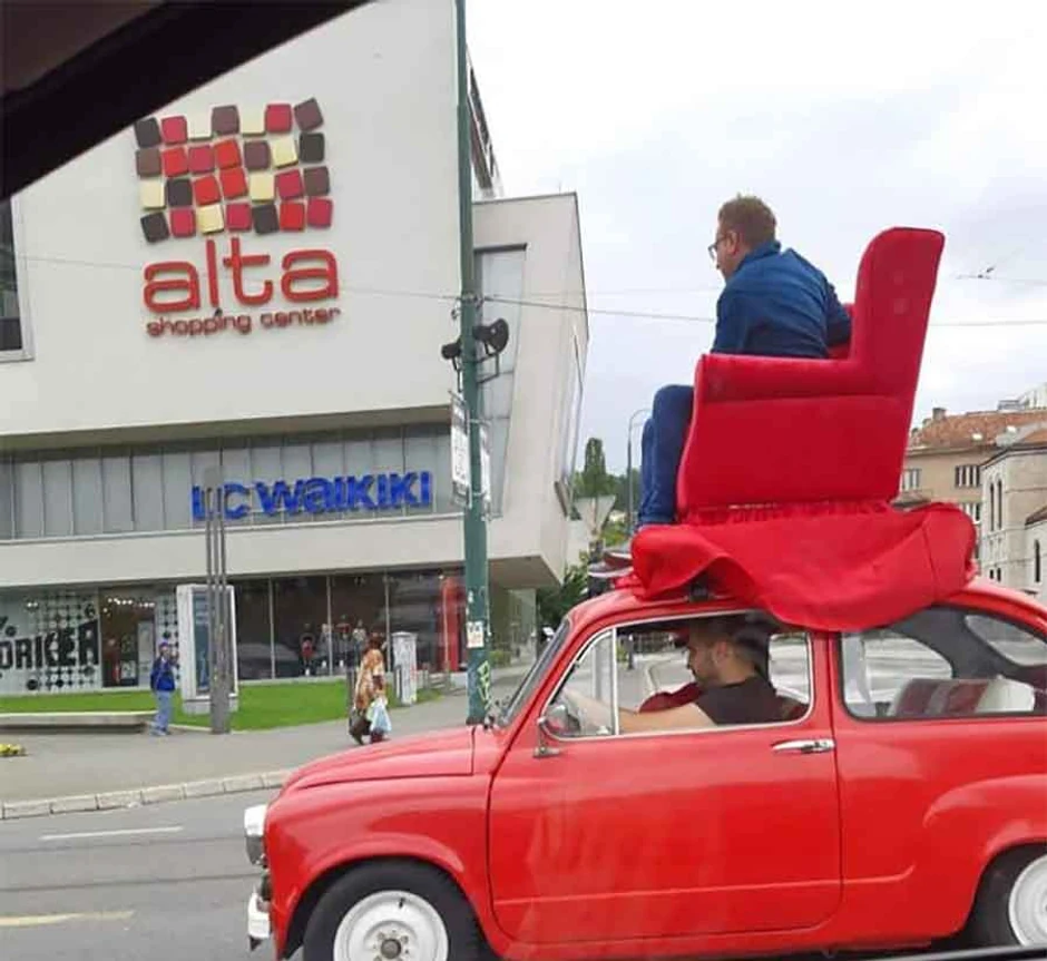 Naime, glavnom saobraćajnicom, u ulici Zmaja od Bosne, ispred SCC-a muškarac je provozao crvenog “fiću”, koji je na krovu imao pričvršćenu crvenu fotelju u kojoj je opušteno sedeo drugi muškarac i razgledao po gradu.