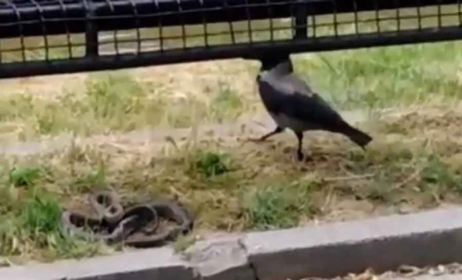Kao što se može videti na snimku zmija je u jednom trenutku došla ispod klupe, a na isto mesto je stigla vrana nakon čega je prvo krenulo odmeravanje protivnika koje je rezultovalo napadom.