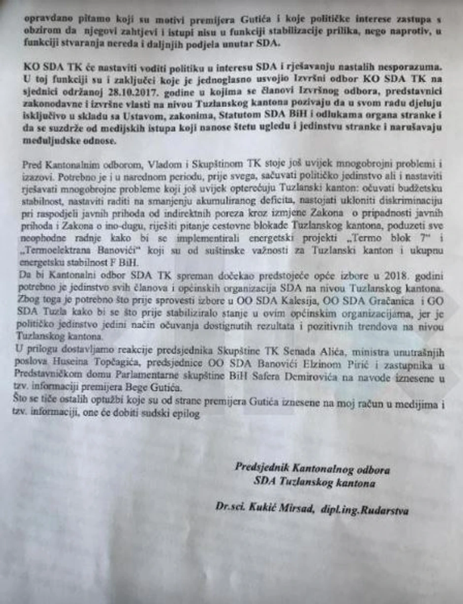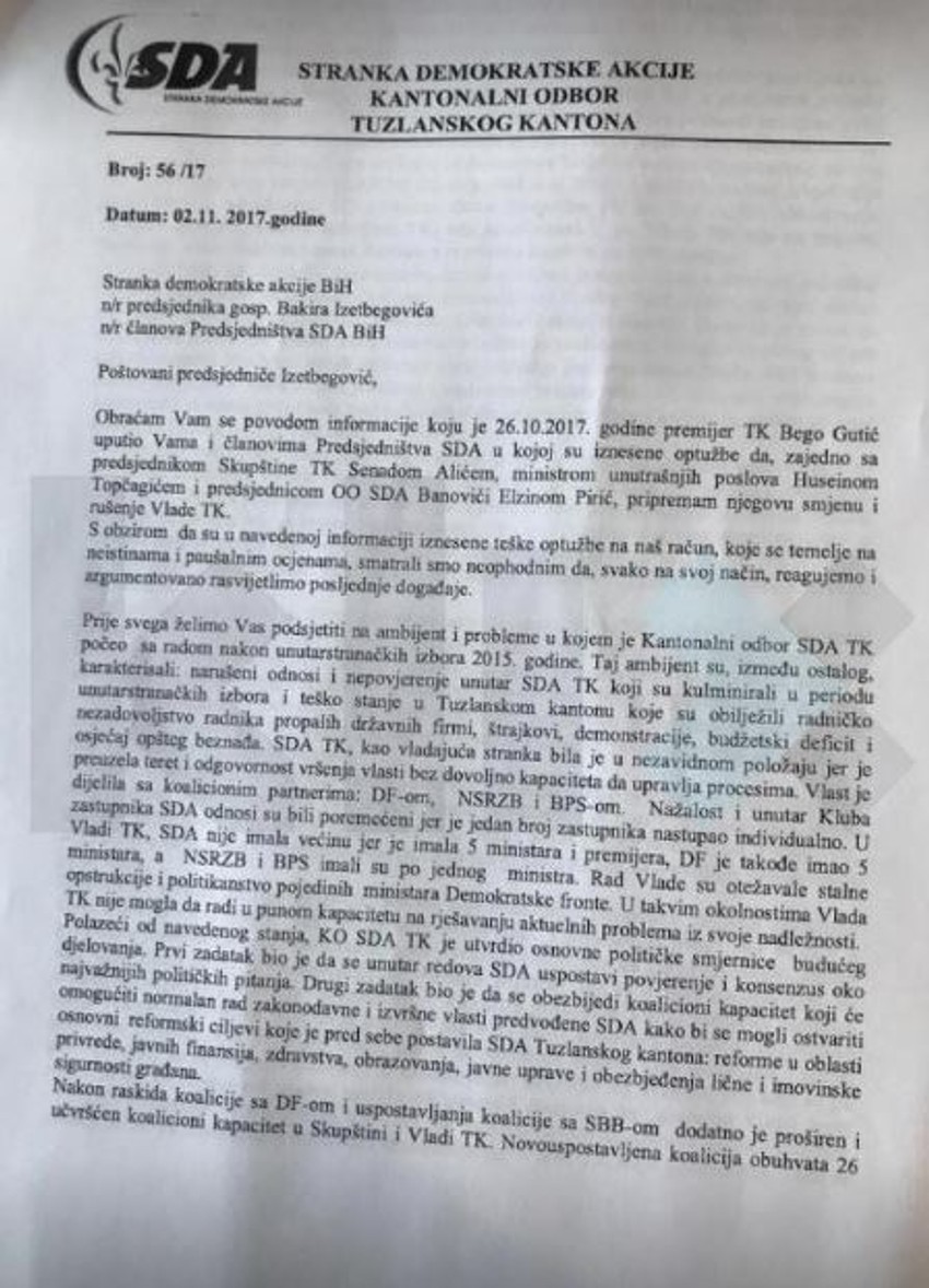 - Trenutno Tužilaštvo ima samo posredna saznanja i informacije o navodima iz pisama i komunikacije kantonalnih čelnika i predstavnika SDA s centralom stranke u Sarajevu. Trenutno dostupne informacije se preliminarno ocenjuju. Dakle, u toku je procena dostupnih informacija i prerano je govoriti o tome u kojem pravcu će dalje postupati tužilaštvo - rečeno je iz Kantonalnog tužilaštva Tuzla, piše Klix.ba.