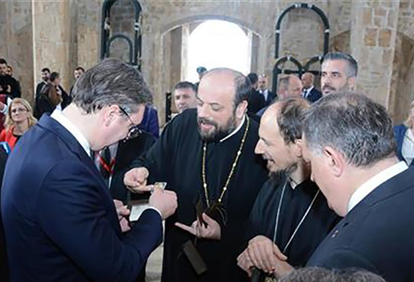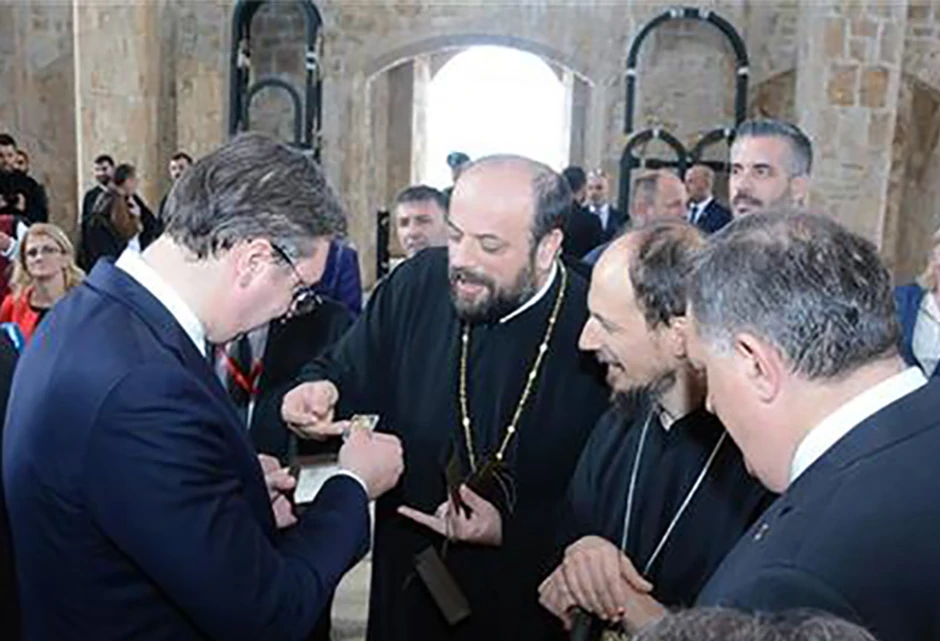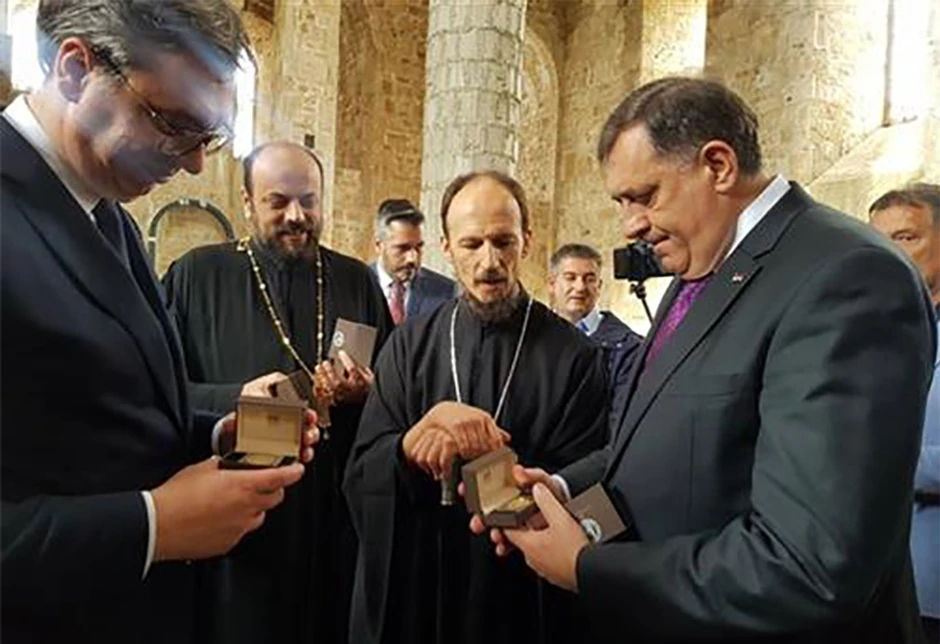 Njegovo preosveštenstvo episkop zahumsko-hercegovački i primorski Dimitrije darovao je danas predsedavajućeg Predsedništva BiH Milorada Dodika i predsednika Srbije Aleksandra Vučića zlatnicima na kojim je ugraviran Saborna crkva Svete Trojice u Mostaru.