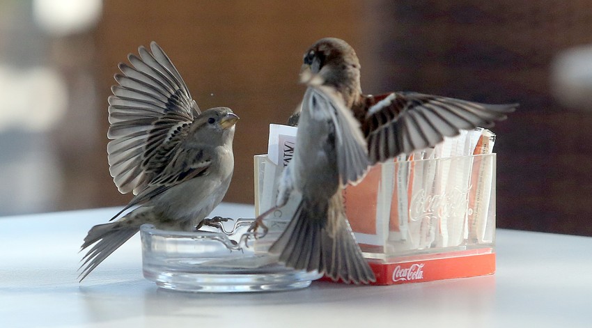 Naime, građani koji su odlučili da uživaju u popodnevnoj kafici na otvorenom, ugođaj su delili sa vrapcim, koji su sleteli na jedan sto, pored šećera, i po svemu sudeći svojski se borili za ovaj beli slatkiš.