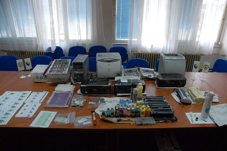 Policijski službenici brčanske policije su pre devet dana, prilikom pretresa stambenog objekta u kome su štampani falsifikati, pronašli 189 delimično pripremljenih novčanica u apoenima od po 100 evra, četiri novčanice u apoenima od po 100 evra, kao i profesionalnu računarsku opremu koja je korišćena za falsifikovanje novca.