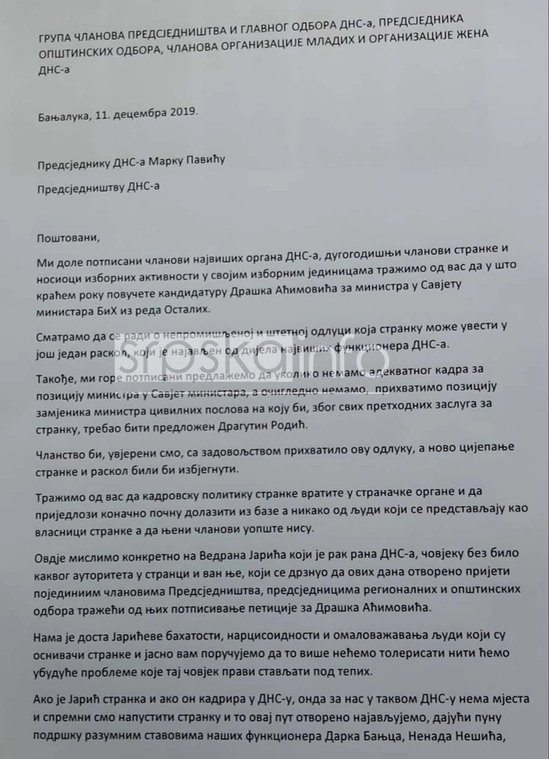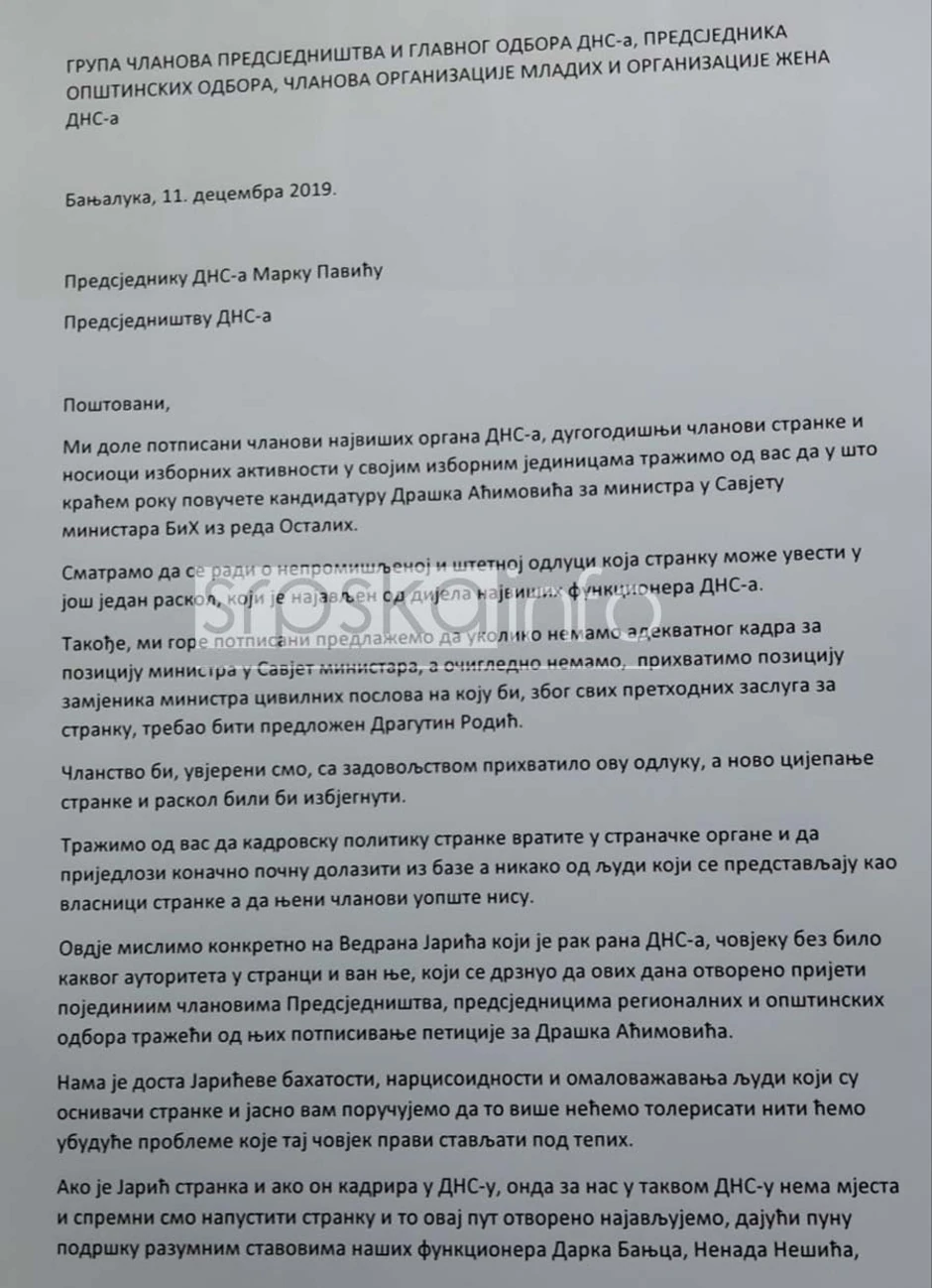 Grupa članova Predsedništva i Glavnog odbora DNS, predsednika opštinskih odbora, članova organizacije mladih i organizacije žena ove stranke, planiraju da pošalju dopis predsedniku stranke Marku Paviću, u kojem će zatražiti da povuče kandidaturu Draška Aćimovića za ministra u Savetu ministara BiH.