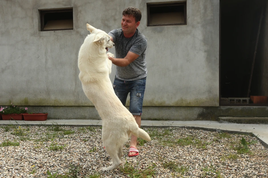 Po dolasku u dvoriše porodične kuće Jović primetili smo neobičnu vrstu psa, a domaćin nam je otkrio da je reč o belom vučijaku.