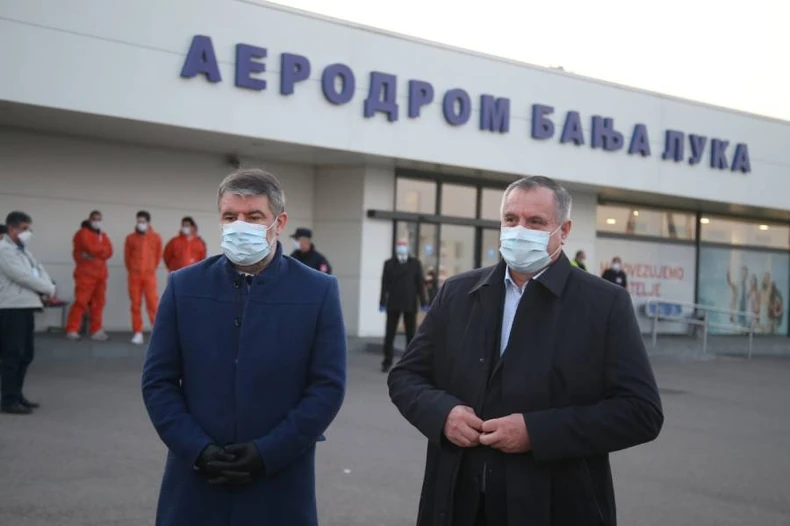 Avion sa opremom iz Nemačke na Međunarodnom aerodromu Banjaluka čekaju predsednik Vlade RS Radovan Višković i ministar zdravlja i socijalne zaštite Alen Šeranić, a očekuje se i dolazak srpskog člana Predsedništva BiH Milorada Dodika.
