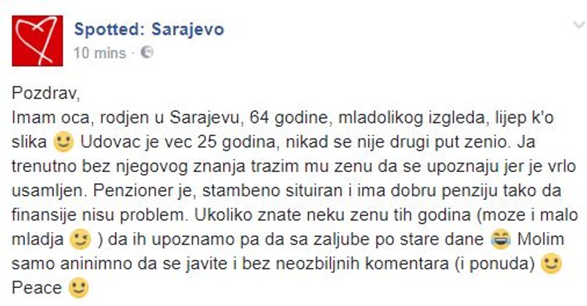 Na društvenim mrežama momci traže devojke, devojke momke, ali na Balkanu se retko dešava da deca traže novu ljubav roditeljima. Tako je na popularnoj “Fejsbuk” stranici “Spotted: Sarajevo” objavljena poruku posredstvom koje sin ili ćerka ocu traži životnu saputnicu.