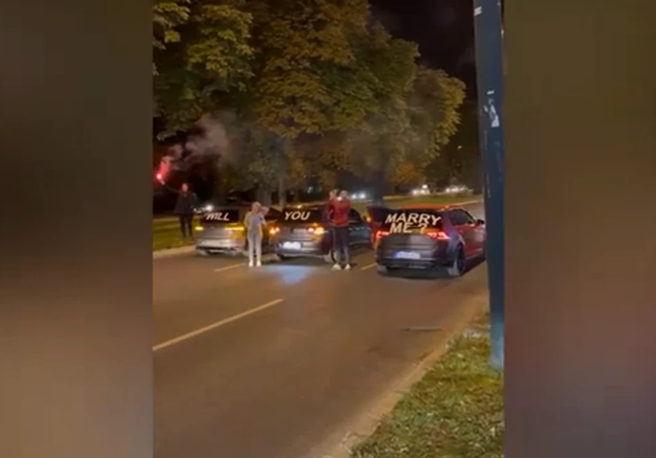Neobična prosidba dogodila se sinoć na ulicama u Sarajevu, kada su par presrela tri automobila na kojima je bilo ispisano: "Hoćeš li se udati za mene".