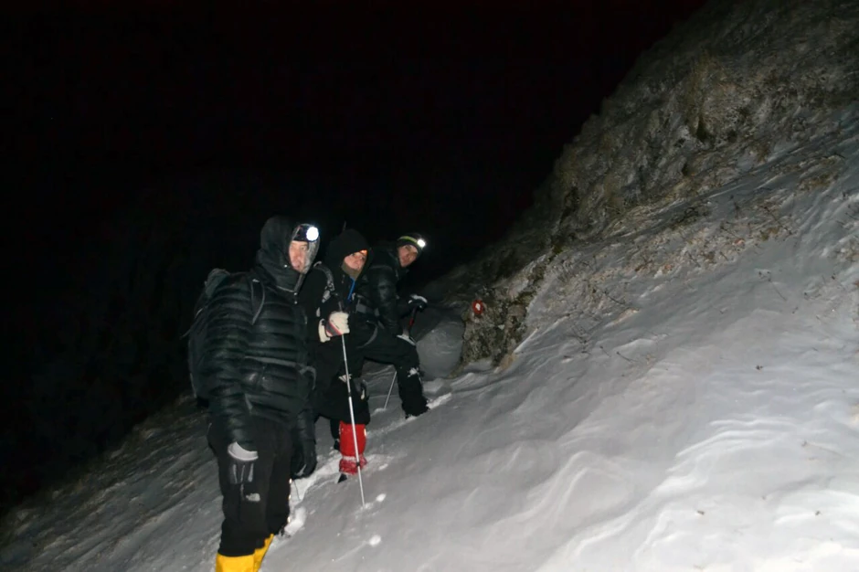 Uspon je trajao četiri sata, sat vremena duže od planiranog, jer od snežnih smetova nisu uspeli da se automobilom probiju do predviđene polazne tačke. Šimović navodi da je noć bila vedra, ali mračna, zbog mladog meseca, pa se moglo videti samo onoliko koliko dobacuje svetlost čeonih lampi. Koristili su navigaciju, a pomogle su im i markacije na stazi.