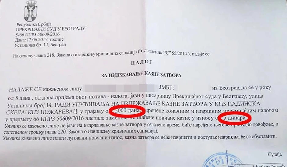 BIZARNA SUDSKA GREŠKA Beograđanin osuđen na 5.000 DANA ZATVORA zbog neplaćene kazne od 5 DINARA?!