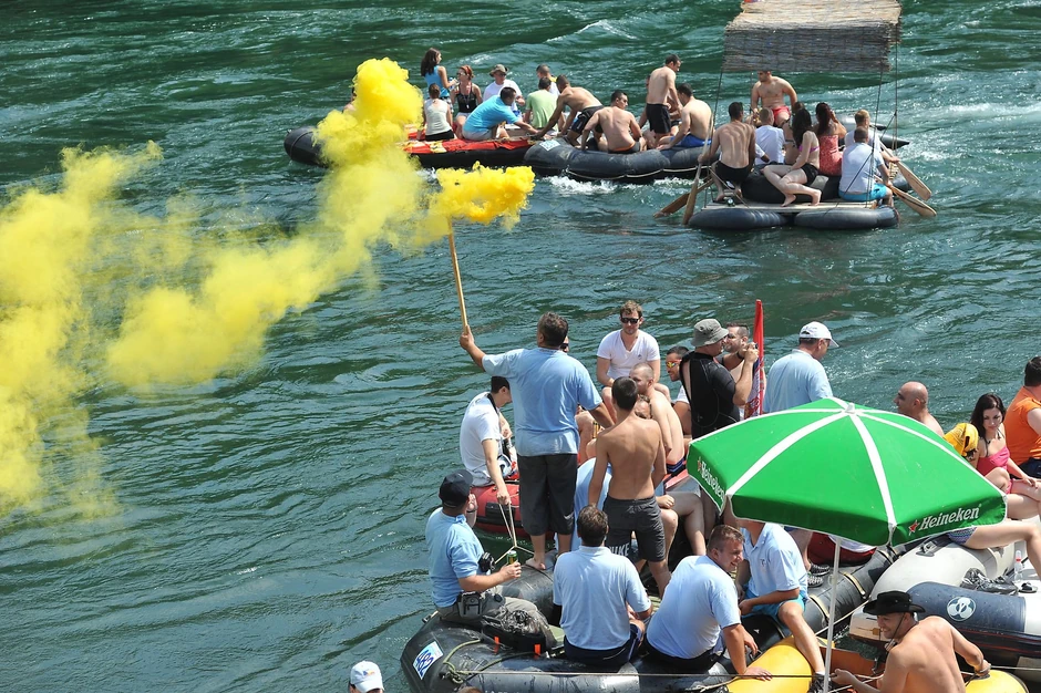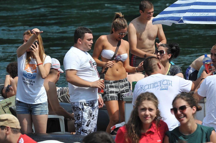 -Zato smo morali da spremimo solidne količine piva da utolimo žeđ- kaže Nejc, dok sa divljenjem gleda drvene splavove na kojima svira muzika uživo, konobari služe goste koji sede za stolovima. I spuštaju se plahovitom Drinom. Kao i obično najveća gužva je oko čamca sa trubačima. Stotine plovila ih opkolilo i svi se njišu u ritmu „mesečine“. Tu je, kao i prethodnih šest godina i ekipa firme FIMA iz Mionice. Njihovo plovilo od stiropora ove godine nije bilo formula nego avion.