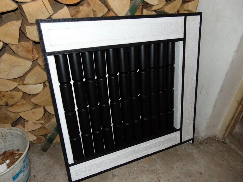 On je napravio ram od iverice dimenzija jednog kvadratnog metra i zolovao stiroporom od tri centimetara, sve to zaštićeno je crnom folijom. Napravljena su ležista za limenke koje su ofarbane u crno, jer tako jače upijaju sunčevu toplotu.
