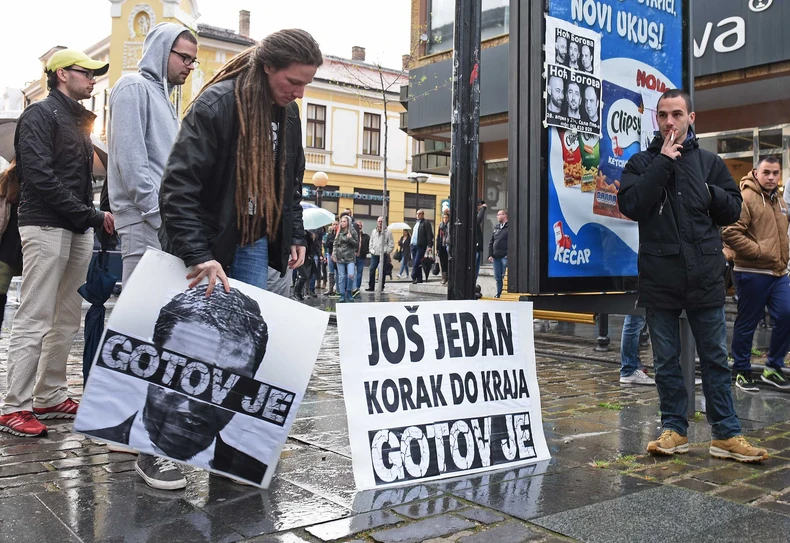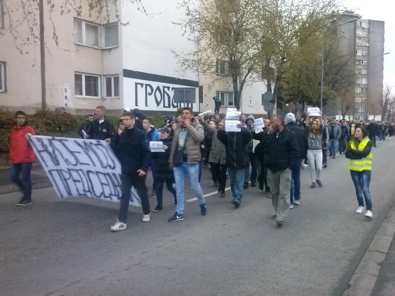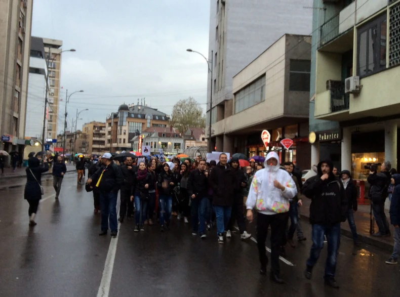 Dok su prolazili graskim ulicama, uzvikivali su "Gotov je" i duvali u pištaljke, a za razliku od prethodnih protesta, večeras su okupljeni istakli nekoliko srpskih zastava.