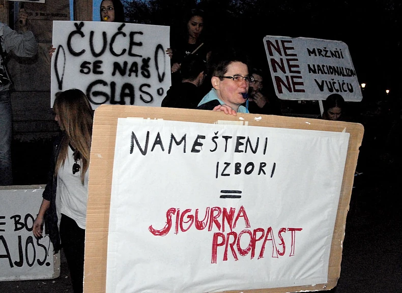 Oni su nosili transparente sa natpisima ’’Stop diktaturi’’, ’’Nismo ničiji, svoji smo’’, ’’Vučiću, Soroše’’. Većina njih imala je pištaljke.