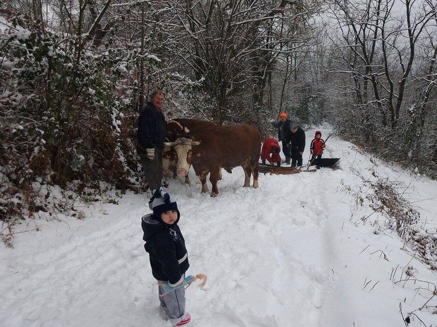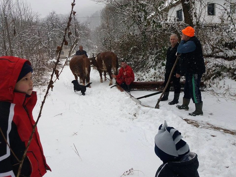 Meštani Gornjeg Amajića kod Malog Zvornika bili su jutros prinuđeni da uz pomoć volova i improvizovane grtače sklanjaju sneg sa seoskog puta.