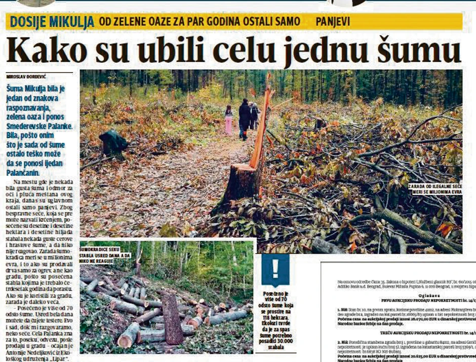Nakon prošlonedeljnog pisanja "Blica", a pošto su se i drugi mediji zainteresovali za višegodišnje uništavanje šume Mikulja bespravnom sečom, narednih dana trebalo bi da bude realizovana inicijativa Ekološkog udruženja "Lipar" da ovo devastirano prirodno blago bude oduzeto opštini Smederevska Palanka i predato "Srbijašumama" na upravljanje.