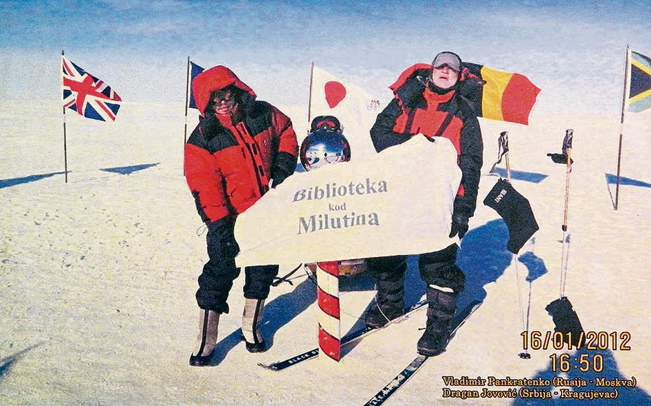 - Dragan Jovović je krenuo u osvajanje najjužnije tačke na planeti i pre polaska svratio u kafanu. Ručao, popio i otišao na put. Neki su na njega i zaboravili, kada je stigla vest sa Antartika. Dragan je tamo, pored one kugle koja označava Južni pol, postavio srpsku zastavu i razvio drugu sa natpisom “Biblioteka kod Milutina”... Čudili smo se čudom jer je pored sve svoje muke, na 60 stepeni ispod nule i 110 kilometara hoda na skijama, poneo i to - priča Miloš Rašković, koji vodi kafanu.