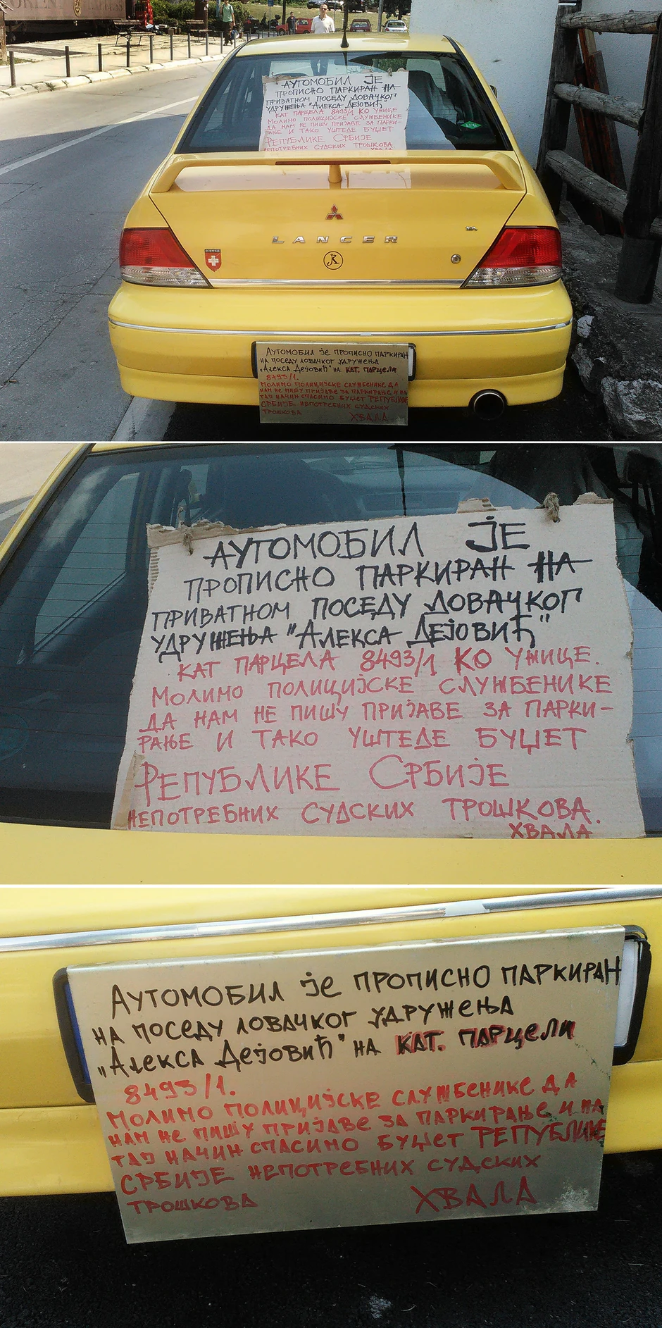„Kat parcela 8493/1 KO Užice. Molimo policijske službenike da nam ne pišu prijave za parkiranje i tako uštede budžet Republike Srbije nepotrebnih sudskih trošova. Hvala!“.