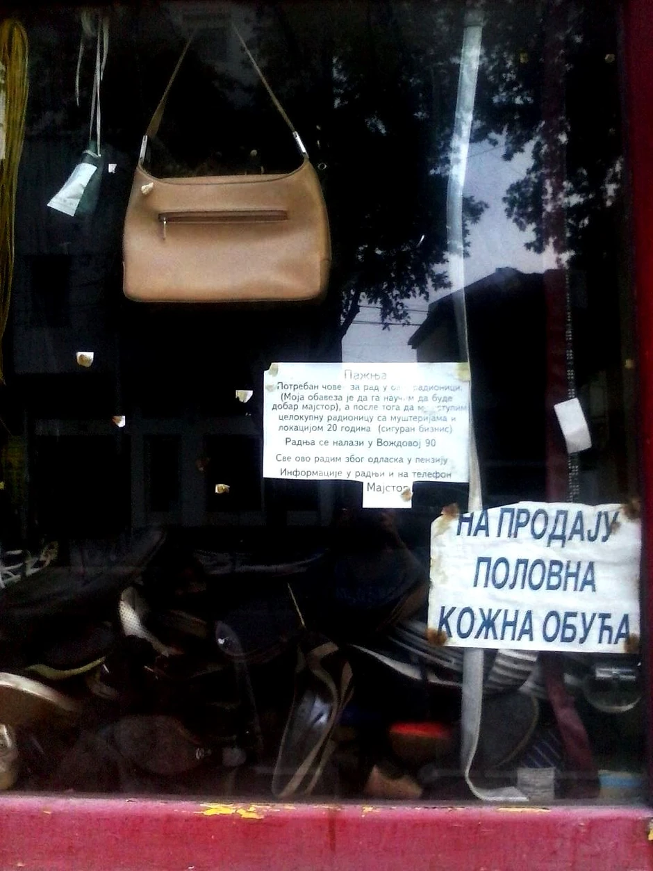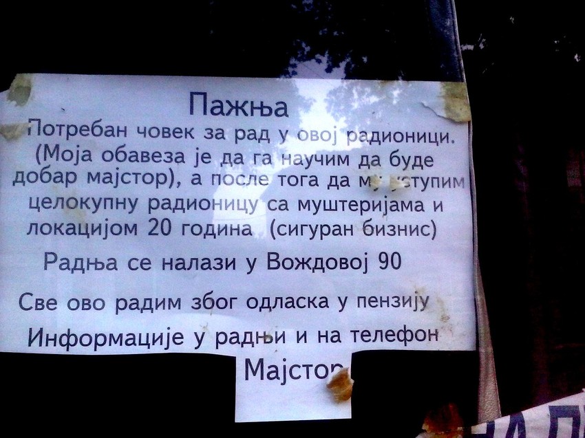 Zanatlija iz Niša, koji 20 godina drži radnju u Voždovoj ulici, postavio je nesvakidašnji oglas na izlogu  u kome nudi posao, radnju, zanat  i siguran biznis, kako bi on mogao da ode u penziju.