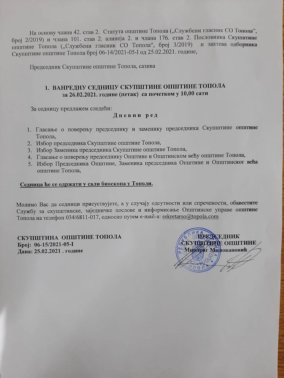 Sve će biti jasnije već sutra kada se u Topoli održava redovna sednica Skupštine za koju su najavljenje i neke personalne promene u rukovodstvu i gde je moguće da odbornici grupe građana Novi ljudi preuzmu neku od funkcija u vođenju opštine. Upravo Novi ljudi su godinama bili žestoka opozicija Jovanoviću u Topoli, a nakon ovih izbora bili su tas na vagi da se smeni Dragan Jovanović i svoju podršku koaliciji SNS-SPS uslovili su transparentnim radom novih opštinskih vlasti.