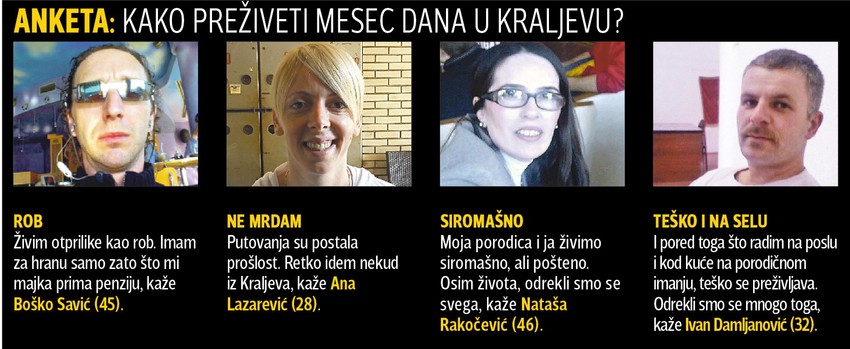 U Kraljevu, prema evidenciji NSZ, ima 13.000 nezaposlenih, a kupovna moć je toliko opala da se na pijaci skoro sve kupuje bukvalno na grame. U mesarama se kupuje jedna viršla, oblačenja na najlon pijaci su postala uobičajena pojava, a porodični izlasci su davna prošlost.