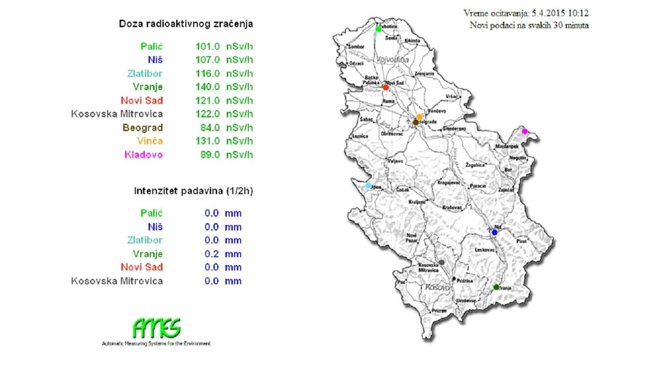 Podaci se obnavljaju na svakih pola sata, a prema njima najozračeniji grad nije Pančevo, nego Vranje. U njemu radijacija iznosi 140 nanosiverta na sat, čak za devet više nego u Vinči, koja je na drugom mestu. Na trećem mestu je Kosovska Mitrovica, a Pančevo uopšte nije na listi.