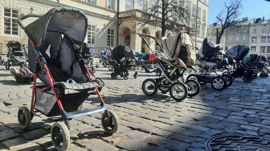 Sto devet praznih kolica postavljeno je na glavnom trgu u Lavovu u znak sećanja na 109 ukrajinske dece ubijene od početka ruske invazije.