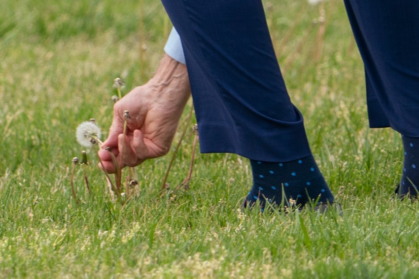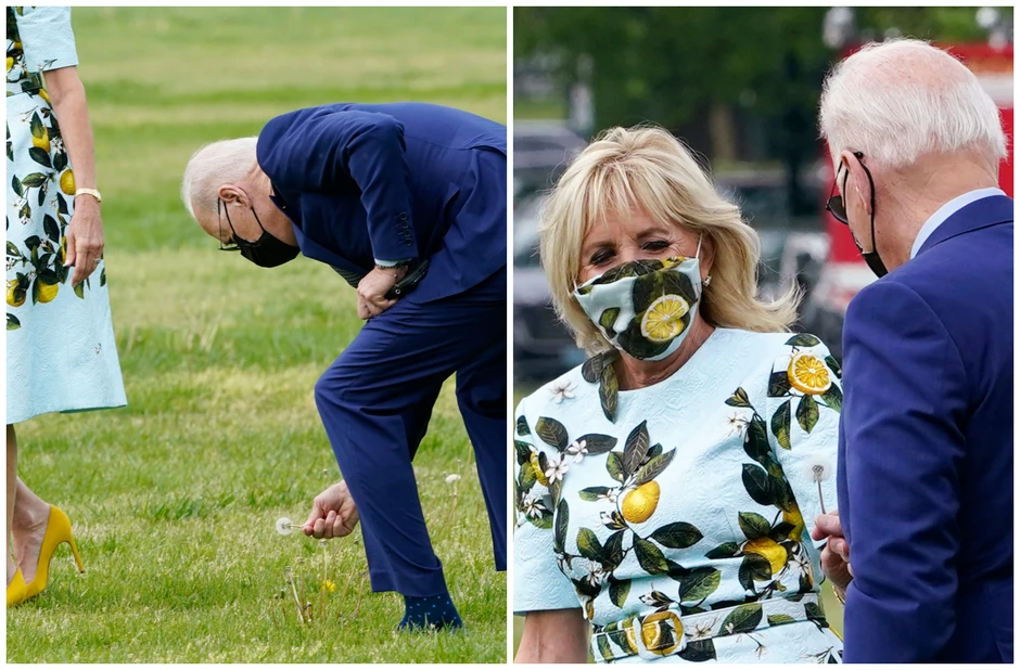 Dok su Bajdenovi hodali travnatom površinom ispred Bele kuće, Bajden se sagnuo i ubrao maslačak, pa ga pružio prvoj dami.