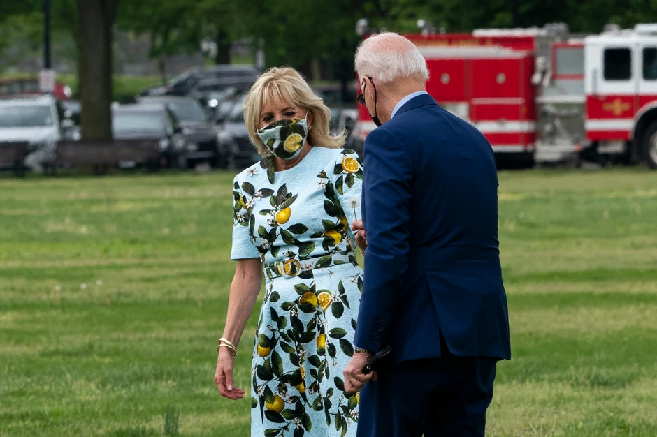 Džil Bajden bila je odevena u svetlo plavu haljinu Oskara de la Rente sa žutim voćem, koju očigledno jako voli jer je često nosi, a koja se prodaje po ceni od 2.890 dolara, prenosi "Jutarnji list".