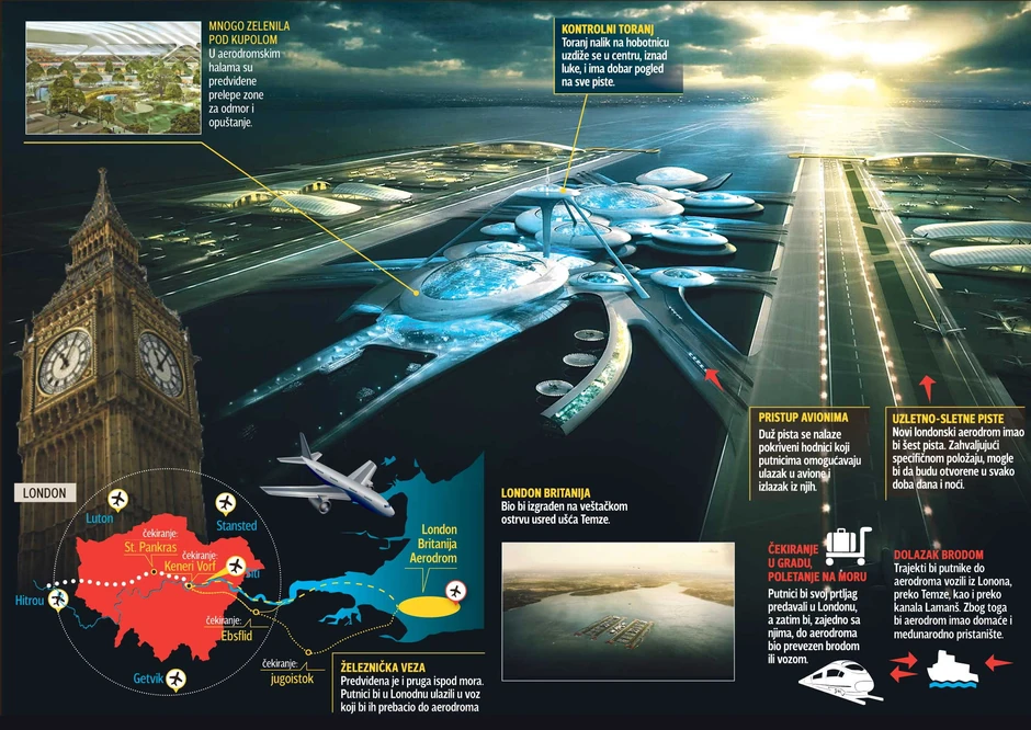 Na veštačkom ostrvu na ušću Temze, 75 km istočno od Londona, trebalo bi da nikne aerodrom budućnosti. Projekat, ploveći aerodrom London Britanija, posebno je želja gradonačelnika Londona Borisa Džonsona.