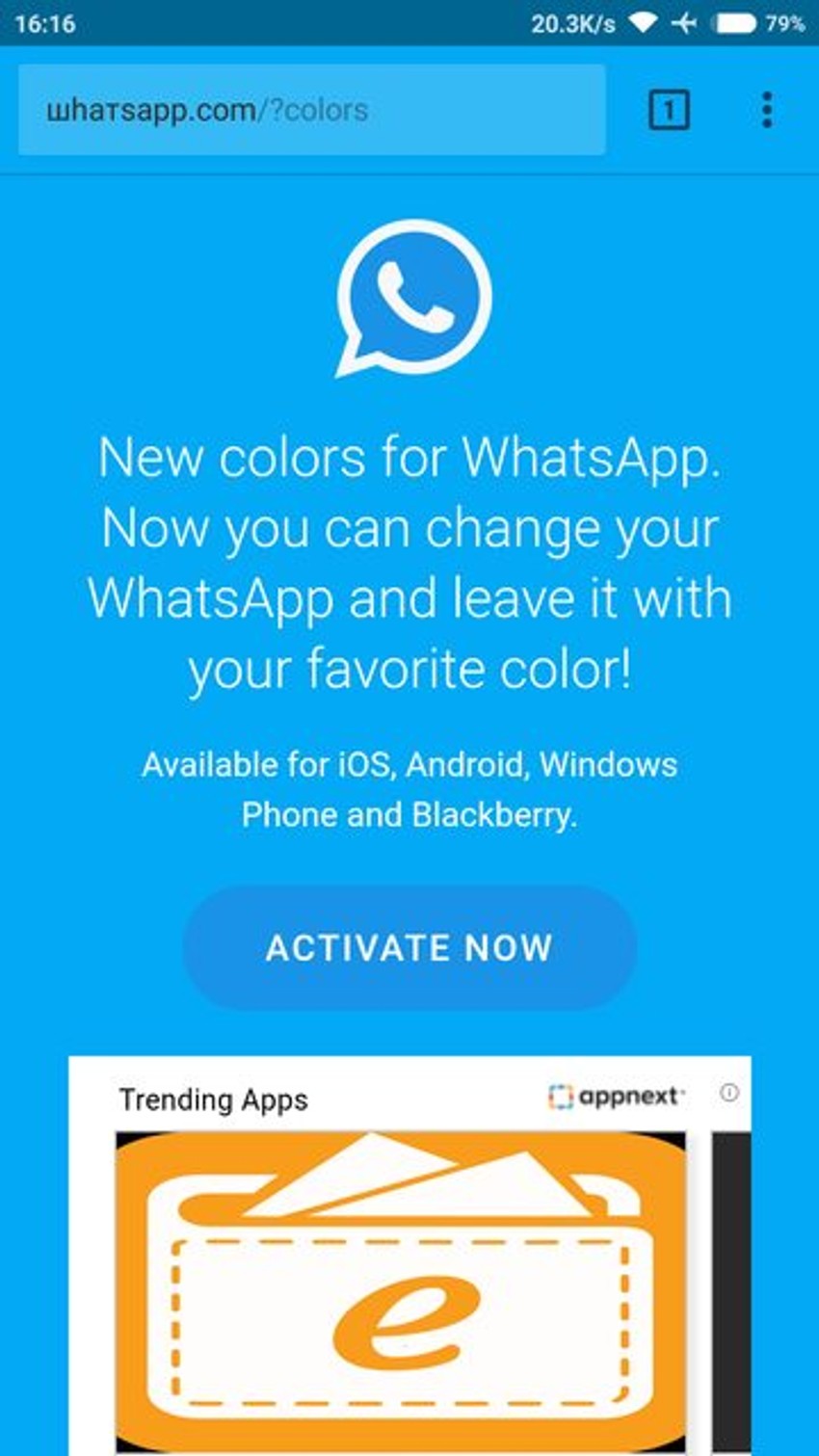 Stranica koristi ćirilićna slova koja nalikuju whatsapp.com (шһатѕарр.com) Posetite li link, dobićete poruku “Nove boje za WhatsApp, sada možete promeniti WhatsApp i ostaviti ga u svojoj najdražoj boji.