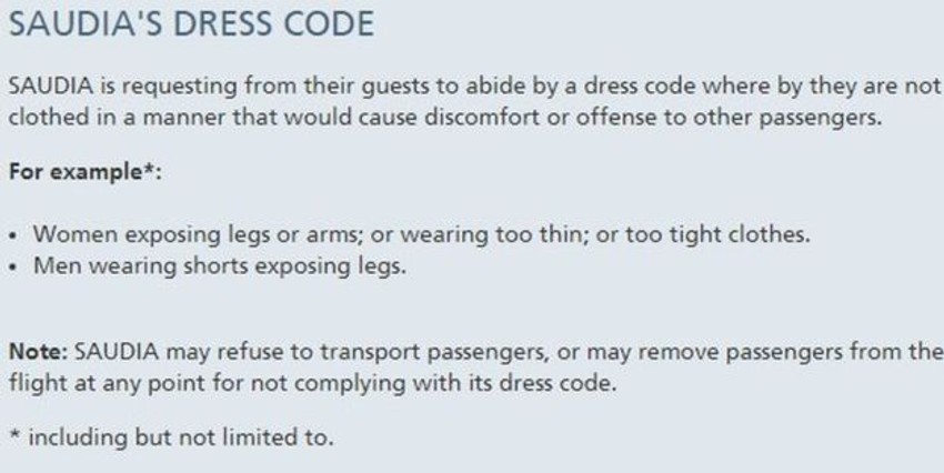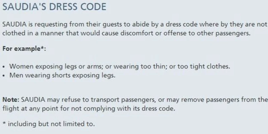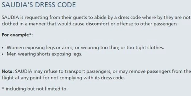 Kako piše na sajtu Saudia.com, od putnika koje putuju saudijskim prevoznikom očekuje se da nose odeću koja "ne vređa ili ne izaziva osećaj neprijatnosti kod drugih putnika". Kada je o ženama reč, to se odnosi na "otkrivanje nogu ili ruku", "nošenje previše tanke (providne) ili preuske odeće". Muškarcima je zabranjen šorts.