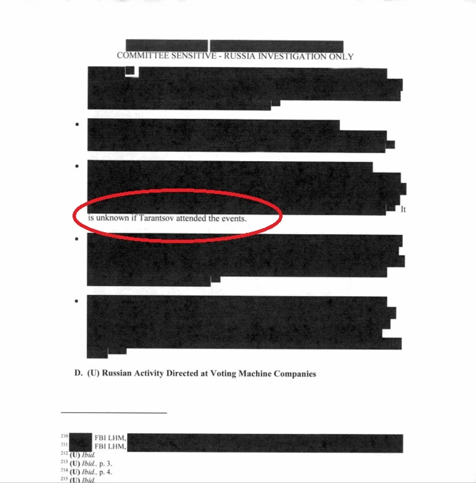 Odeljak izveštaja u kojem je Tarancov imenovan zasnovan je na jednom ili više memoranduma FBI-a i nalazima prisluškivanja prema nalogu Zakona o nadzoru stranih obaveštajnih službi. FBI je odbio da komentariše ovu priču. O Dmitriju Vladimiroviču Tarancovu na mreži gotovo da nema tragova, osim spominjanja na spisku akreditovanih diplomata koji su 2008. godine radili u ruskoj ambasadi u Otavi, u Kanadi.