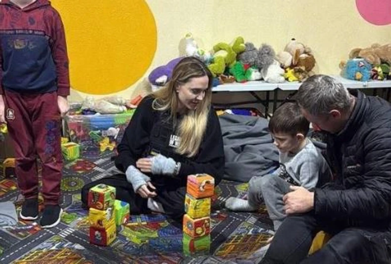 Džoli se igra sa decom u onome što izgleda kao podzemno sklonište. Fotografije se poklapaju sa skloništem u Hersonu o kome su lokalni mediji izveštavali početkom 2025. godine.