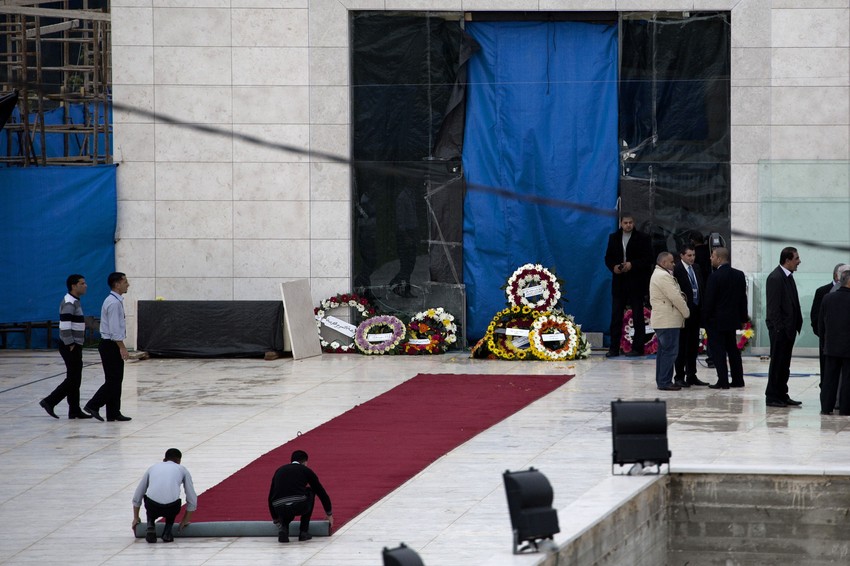 Tokom više nedelja pre ekshumacije Arafatov grob, u mauzoleju u predsedničkom sedišstu Mukata, odakle je on nekad vladao, bio je skriven od pogleda plavom ceradom.