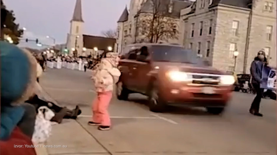 Na video snimku objavljenom na internetu vidi se crveno sportsko terensko vozilo kako prolazi kroz paradu, naletevši na, kako se čini, više od deset ljudi pre nego što je masa potrčala sa trotoara da pruži pomoć.