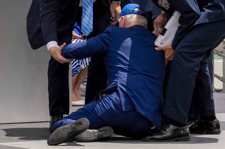 Dok su mu pomagali da ustane, Bajden je pokazivao iza sebe, po svemu sudeći objašnjavajući na šta se sapleo.