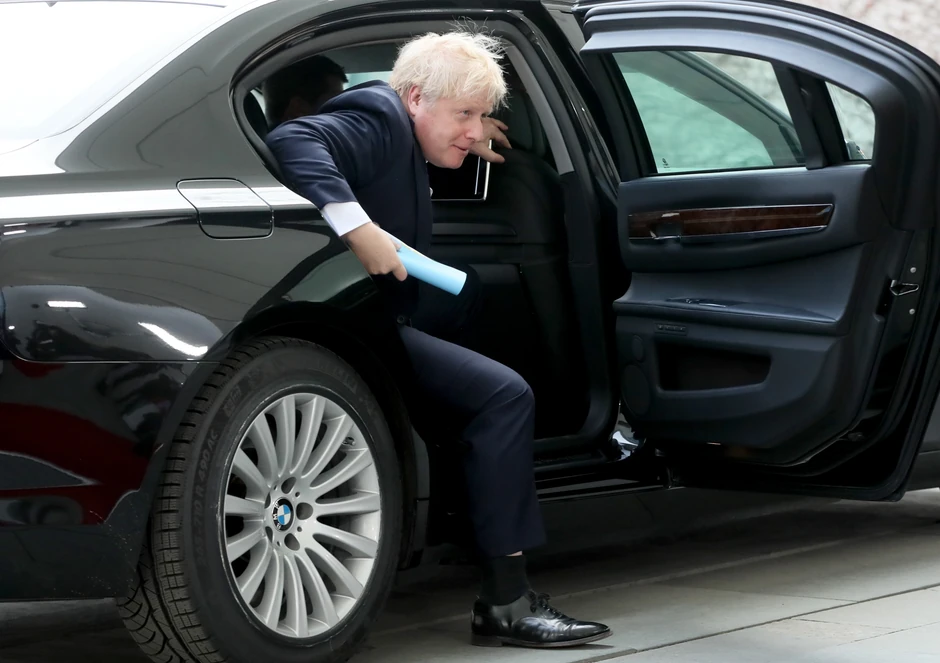 Britanski premijer Boris Džonson namučio se da izađe iz svog automobila nakon što je stigao u Berlin u nedelju, preneo je RT.