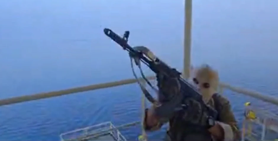 Na snimku se vide naoružani pripadnici iranske vojske, sa maskama, kako se penju po trupu teretnog broda kako bi preuzeli kontrolu.