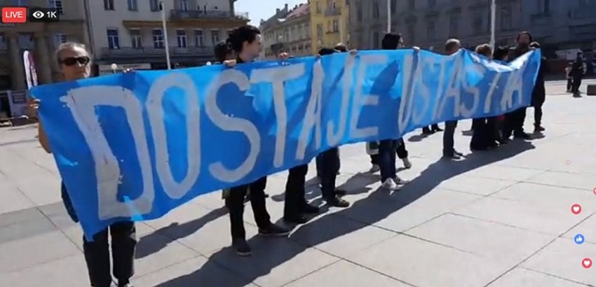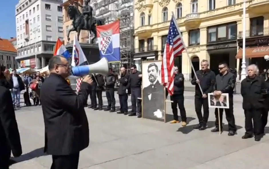 Jedan od desničara dizao je desnicu u vazduh pred kamerama, a na glavnom zagrebačkom trgu dočekao ih je kontraprotest na kojem su okupljeni nosili transparent na kojem piše "Dosta je ustaštva".