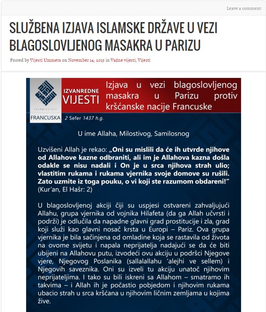 Dok bosanski zvaničnici ošto osuđuju terorističke napade u Parizu, portal na bošnjackom jeziku “Vijesti ummeta”, koji podržava Islamsku državu, o njima danas piše kao o “radosnoj vesti za sve iskrene muslimane”.