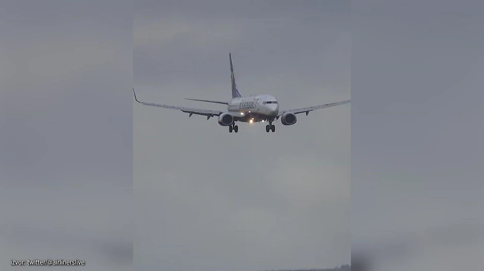 Na Tviteru se pojavio snimak koji prikazuje avion irskog prevoznika Rajan era, koji je pre sletanja na aerodrom u Mančesteru usled jakih vetrova ipak odložio sletanje i nastavio dalje.