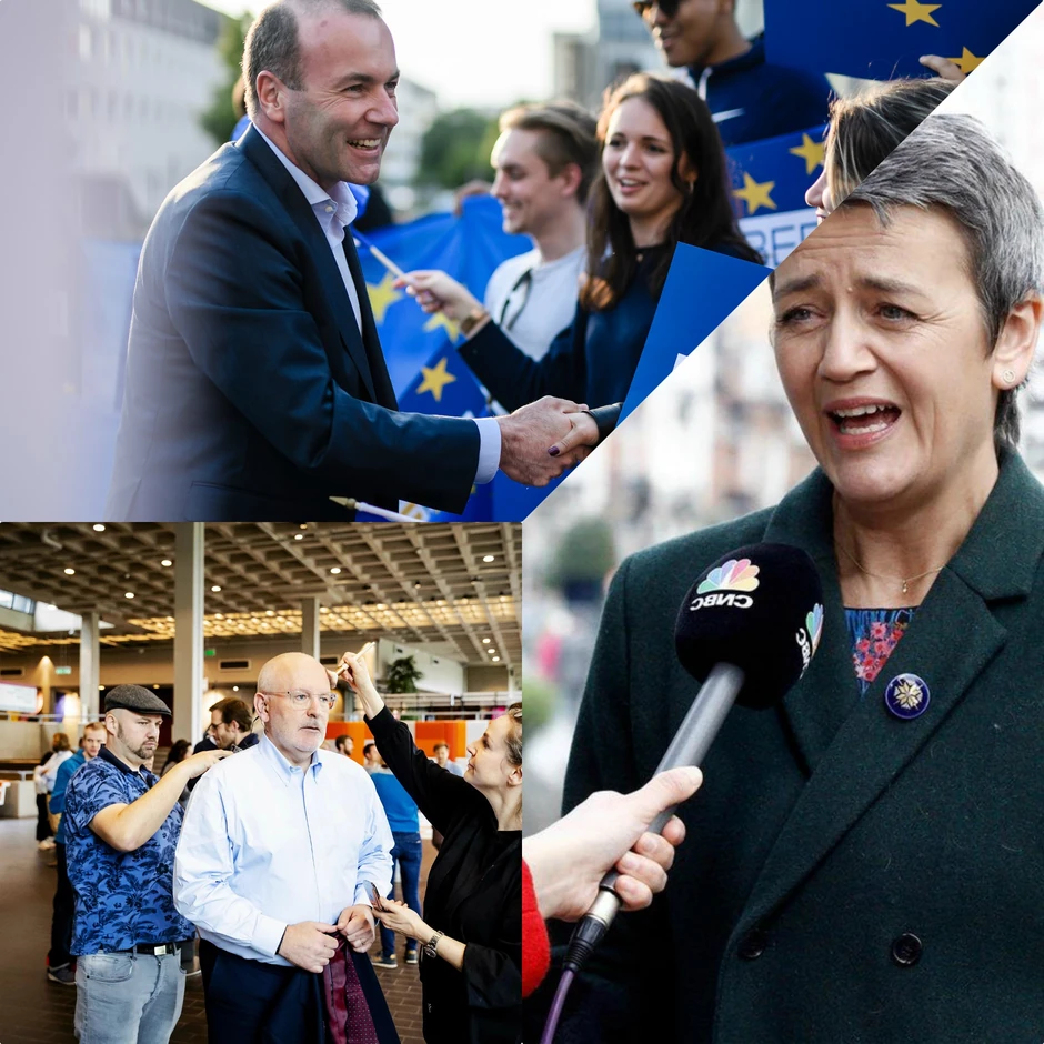 Kandidati su Manfred Veber, Nemac iz Evropske narodne partije (EPP) desnog centra, Frans Timermans, Holanđanin iz partije levog centra Evropskih socijalista (PES), Niko Kue, Španac iz Evropske levice, Ska Keler, Nemica iz Evropske partije zelenih, Jan Zahradil, Čeh iz evroskeptične Alijanse konzervativaca i reformista Evrope (ACRE) i Margret Vestager, Dankinja iz Alijanse Liberala i demokrata za Evropu (ALDE).