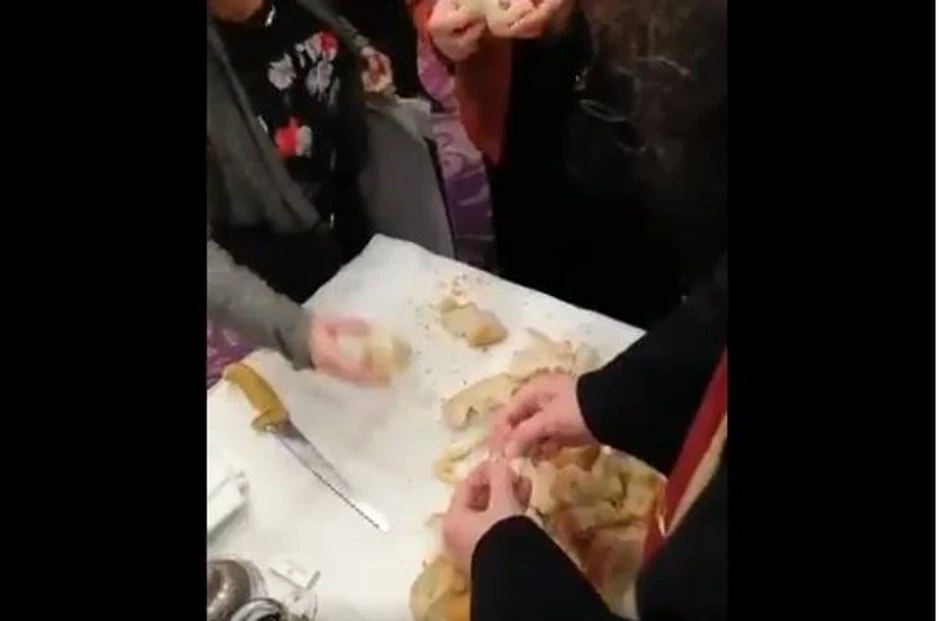Na snimku se vidi kako sveštenik lomi pogaču i pronalazi novčić.