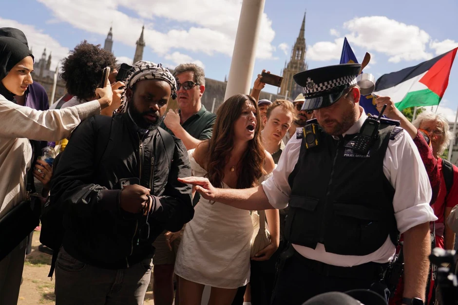 Policija je saopštila da je uhapšen jedan učesnik tog skupa zbog toga što je nosio plakat podrške grupi Palestinska akcija.