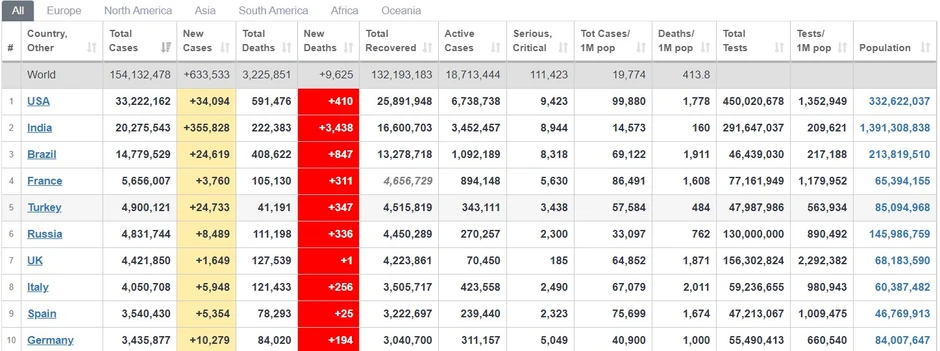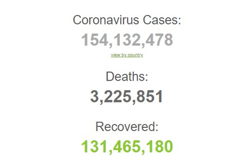 Do sada je od korona virusa obolela 154.099.641 osoba širom sveta, 3.224.724 su preminule, a 131.417.445 se oporavilo od infekcije.